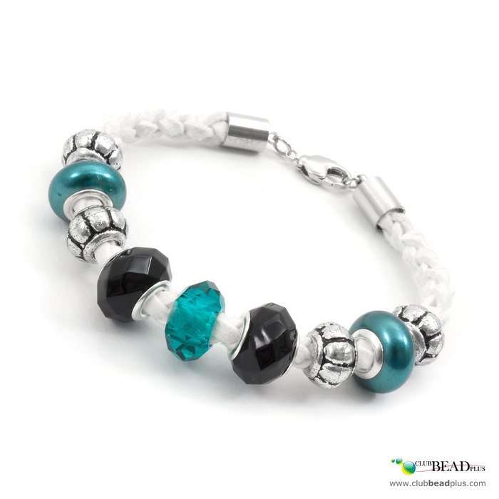 Bracelet composé de billes de style européen et de billes de plastique enfilées sur une tresse à quatre brins de suèdine