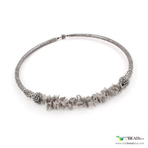 Rigid necklace made with a necklace base on which is strung flexible snake chain, metal beads, Shamballa beads and metal ribbons.