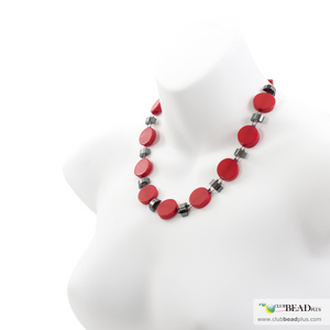 Necklace with 2 strings of resine beads and hematite threaded onto nylon coated steel strings