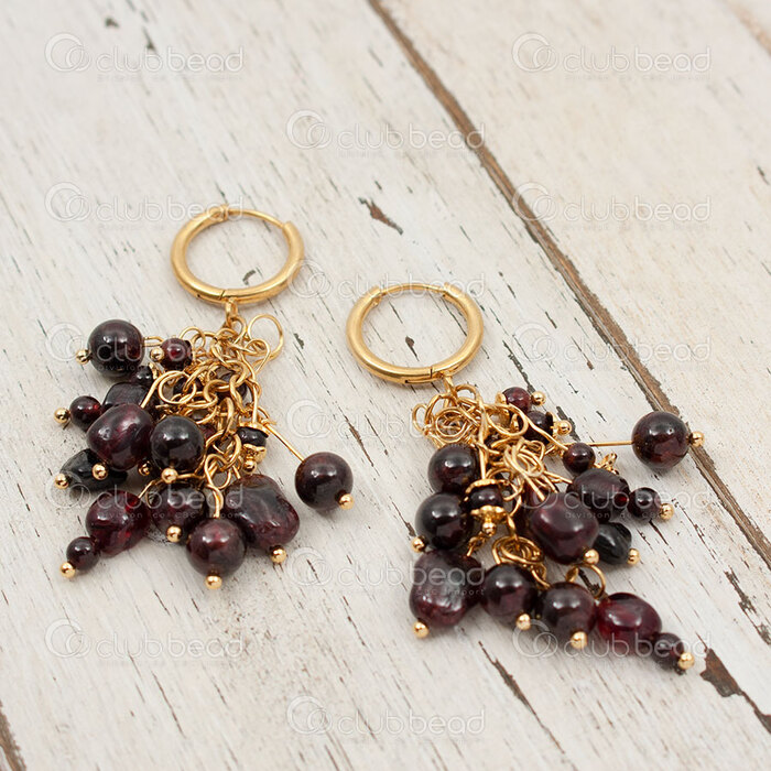 Pretty grape cluster earrings, made of irregular round garnet beads and gold-plated stainless steel elements.