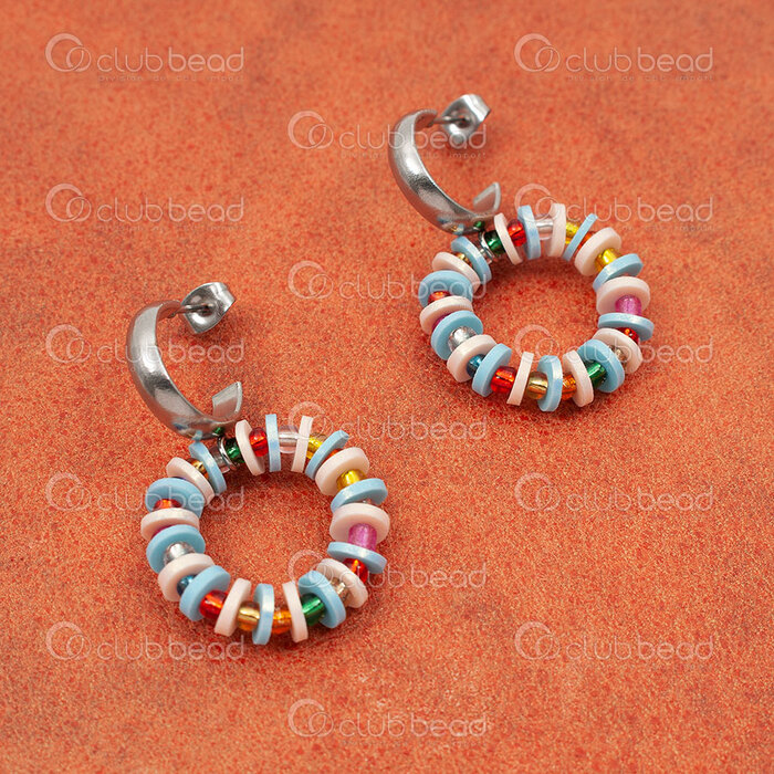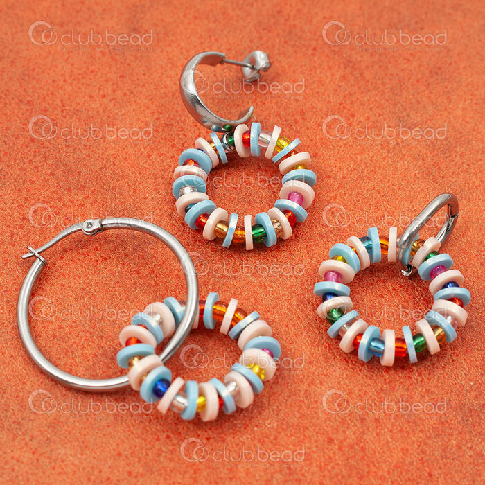 Simple and pretty, these earrings are made of polymer heishi bead rings and seed beads. Add the earring of your choice and you're done.
