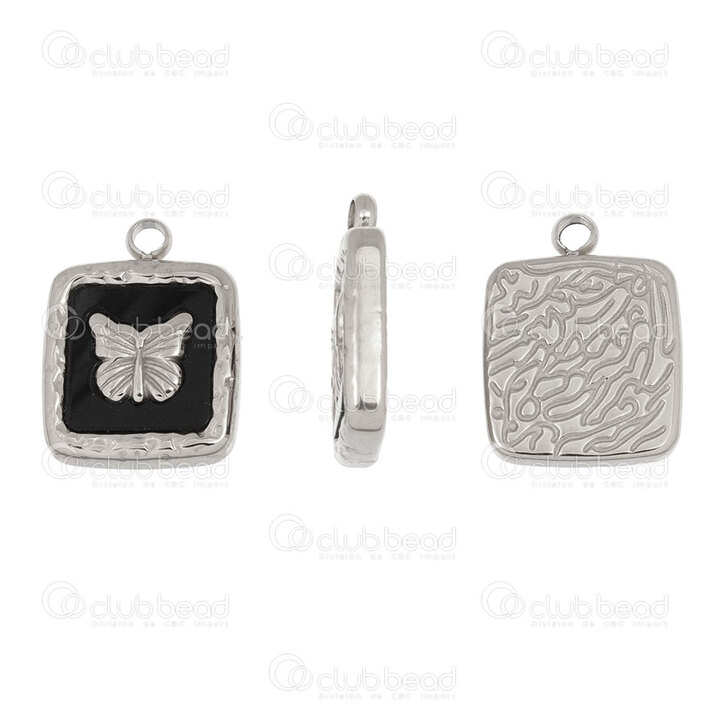 1720-2110-551 - Animal Stainless Steel Charm Square Carved Butterfly 16x12x3mm Black Filling with Loop Natural 5pcs 1720-2110-551,Fil carre,montreal, quebec, canada, beads, wholesale