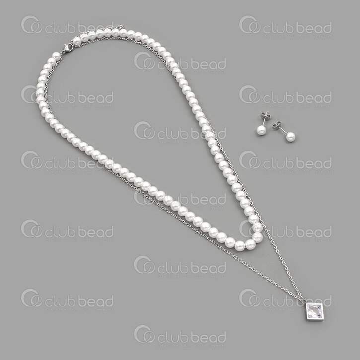 4007-0105-73 - Acier Inoxydable Ensemble Collier Double et Boucle d'Oreille Bille Acrylique Rond 6mm Blanc 16po Chaine Forcat 20po avec Breloque forme Diamant Zircon Cubique Cristal 12.5mm et Boucle d'Oreille Tige 6mm Naturel 1 Ensemble 4007-0105-73,Chaînes,boucles d,montreal, quebec, canada, beads, wholesale